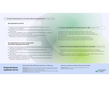 Для забезпечення безперебійної роботи органів державної влади та місцевого самоврядування, а також критично важливих підприємств Уряд запровадив систему бронювання на час воєнного стану. Міністерство економіки України (Мінекономіки) надало алгоритм дій, визначений постановою Кабінету Міністрів України (КМУ) від 27 січня 2023 р. № 76 «Деякі питання реалізації положень Закону України «Про мобілізаційну підготовку та мобілізацію» щодо бронювання військовозобов'язаних на період мобілізації та на воєнний час». 🌿📚 Читати далі: https://bit.ly/4bDxIDo